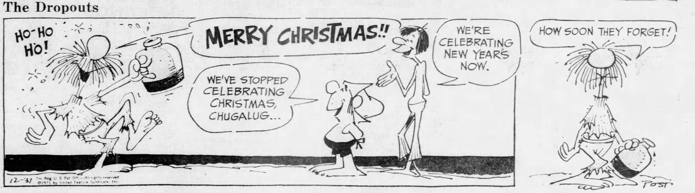 Howard Post is best known for his work on various Harvey Comics publications, most notably Casper the Friendly Ghost, as well as a couple series at DC Comics. His only syndicated feature, The Dropouts, lasted from 1968 to 1971, and was an interesting spin on an old cartoon premise. The two main leads get shipwrecked and stranded on an island, but it's hardly deserted. There is a whole society of people living there, who are called "natives" but who you could easily assume were also shipwrecked and just made the best of it.
